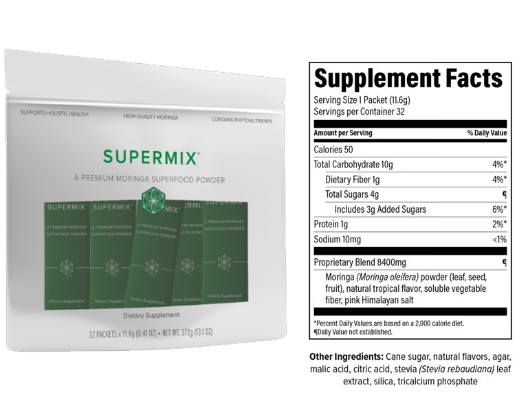 Get your daily dose of nutrition in one refreshing sip. Powered by moringa leaf, seed, and fruit — nature’s most nutrient-dense superfood — SuperMix delivers complete daily nutrition in a convenient stick pack.